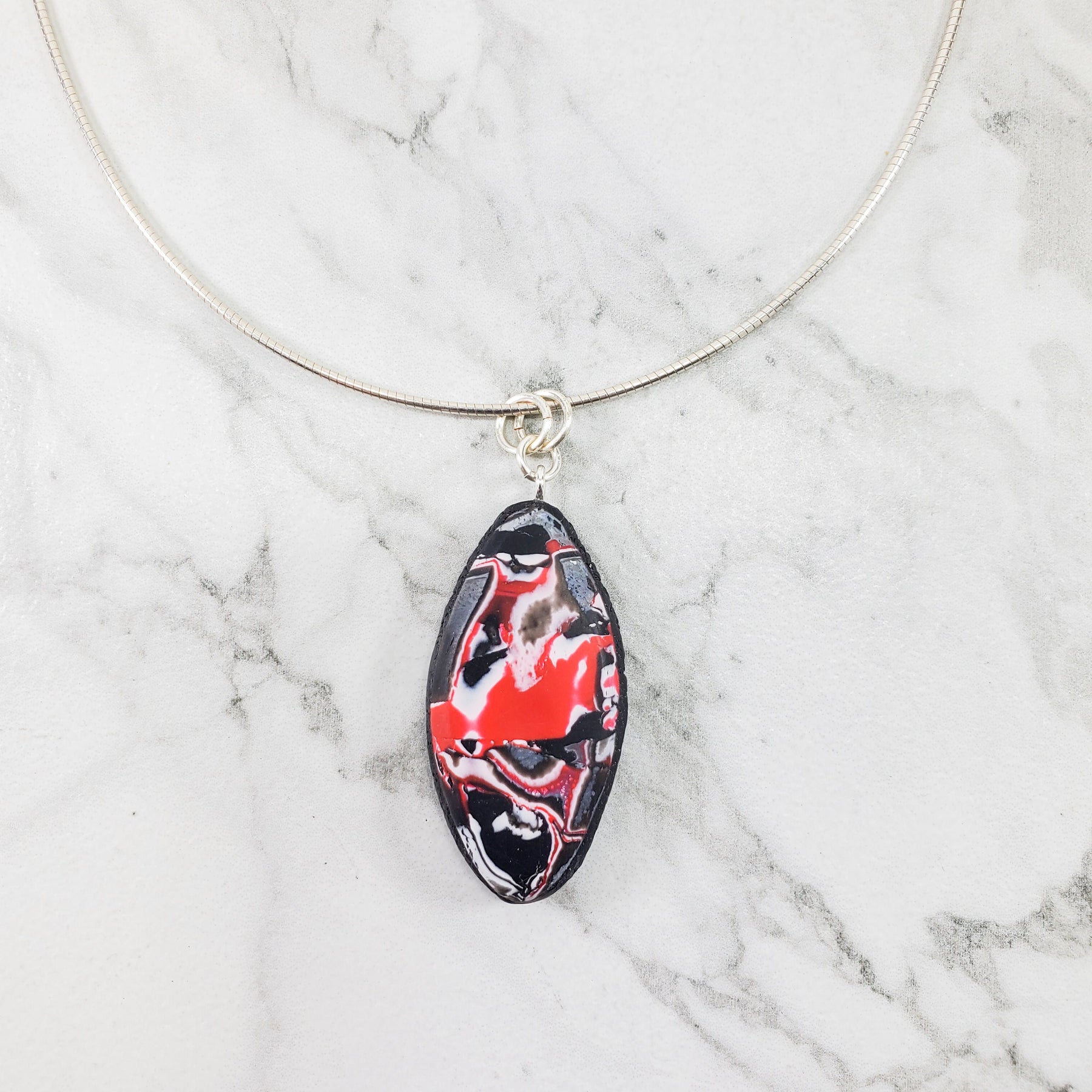 Details: 3/4" x 2" (18mm x 38mm) Oval Pendant. Marbled in shades of black, white, and silver with a dash of sparkle.