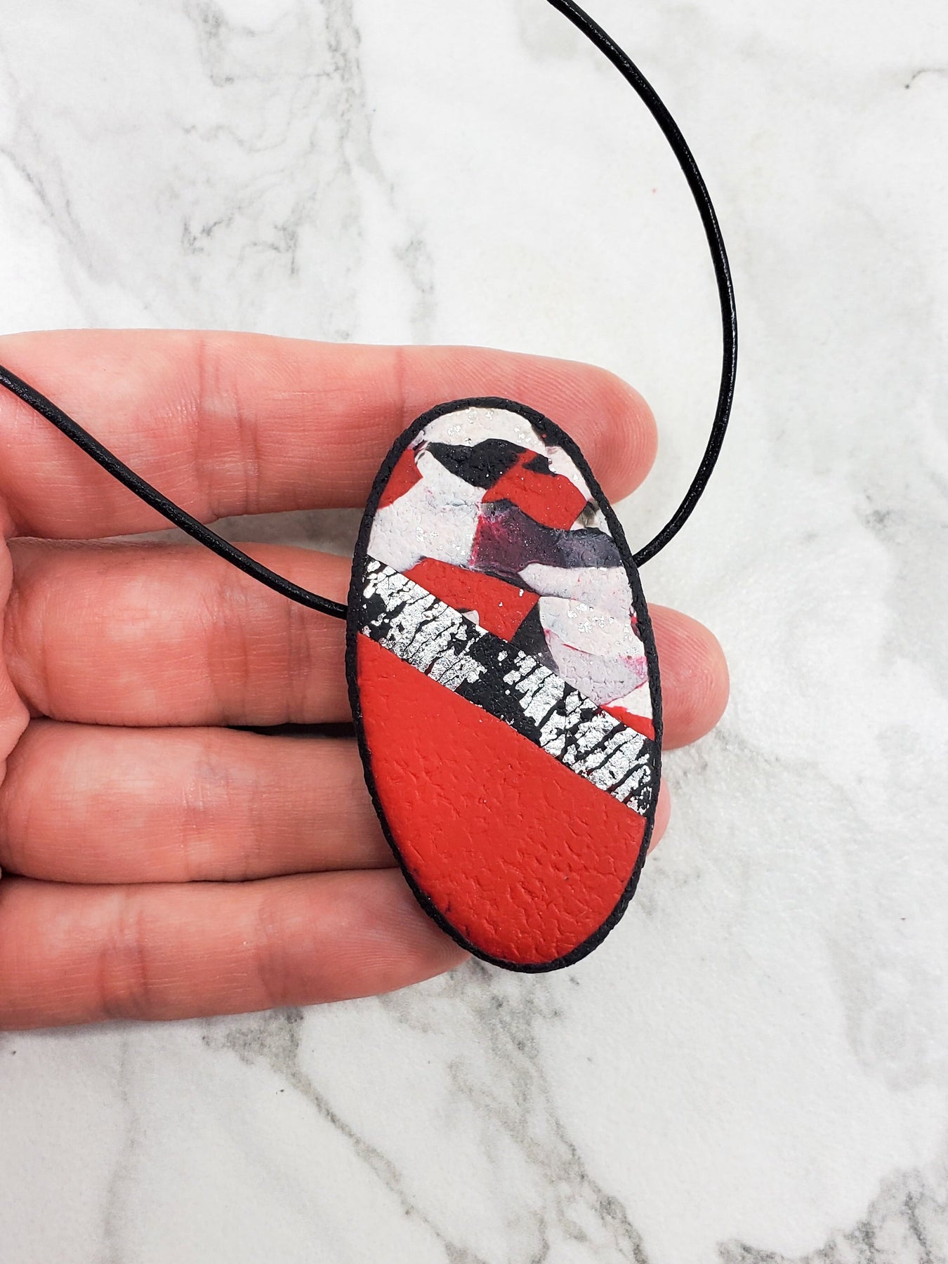 This Striking necklace pendant boasts classic colors, textures, and patterns created from 100% Polymer Clay.