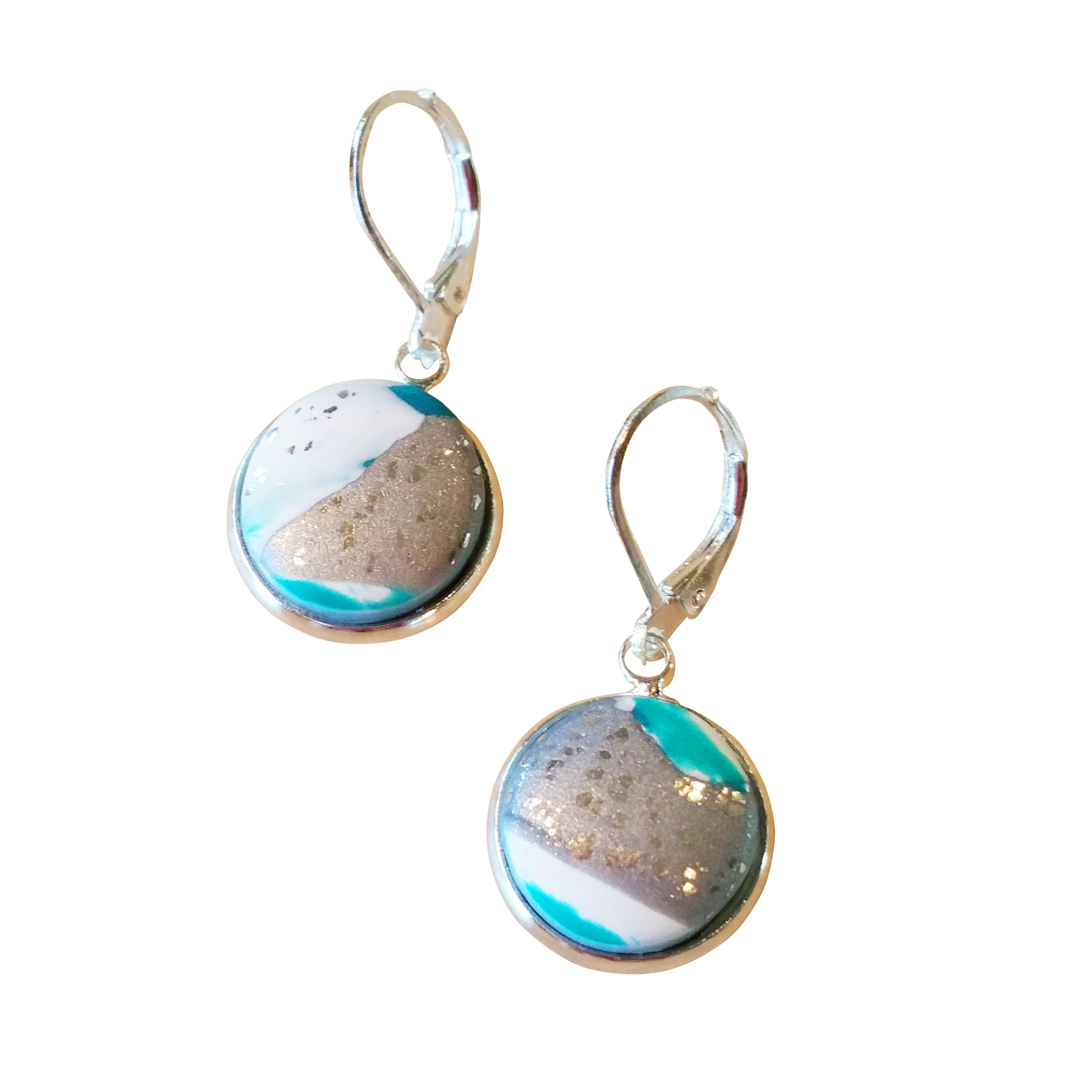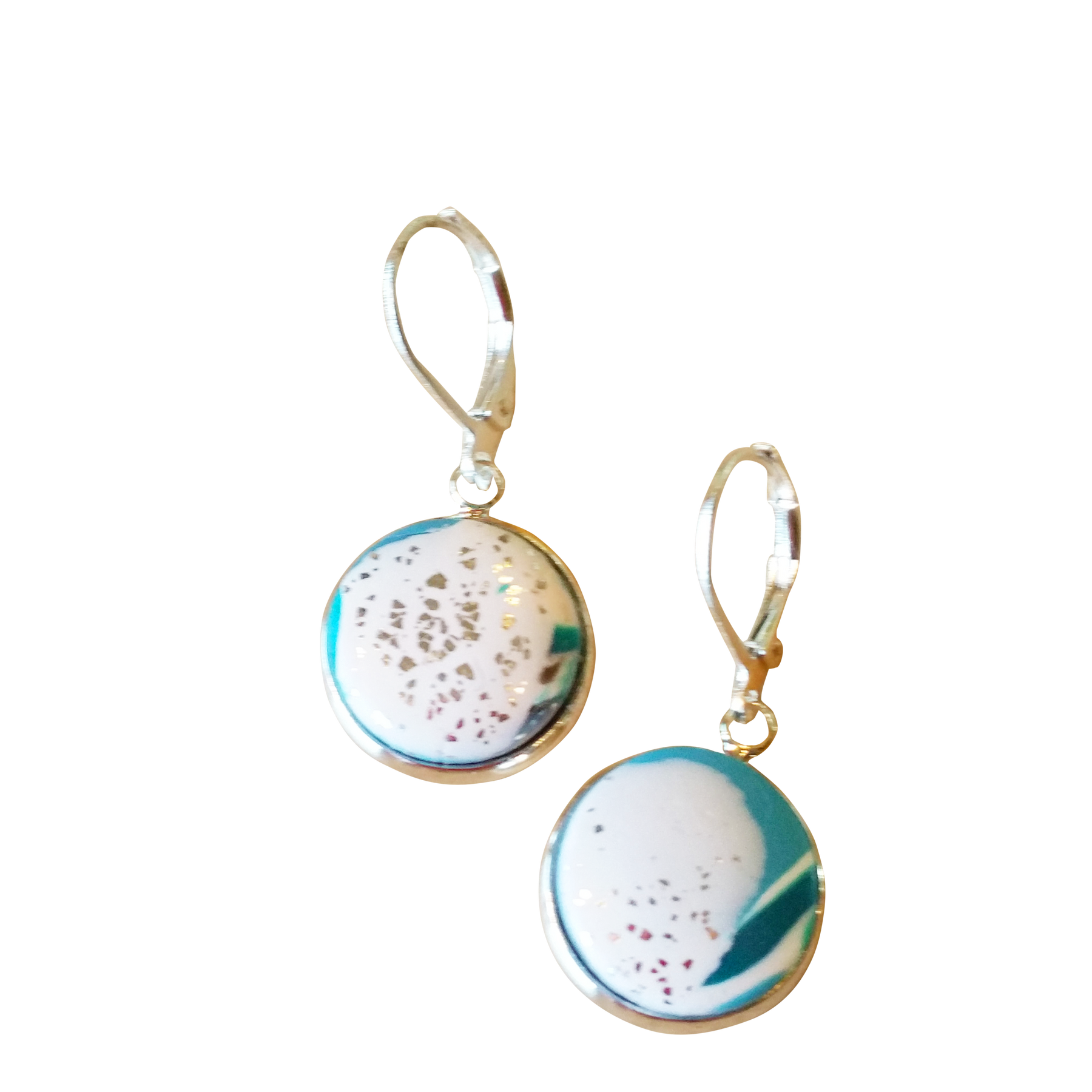 Abstract, Marbled, and Mosaic design, no 2 will be alike, and your earrings will be uniquely your own. Exact coloring of the pieces will vary within the shown color palette.