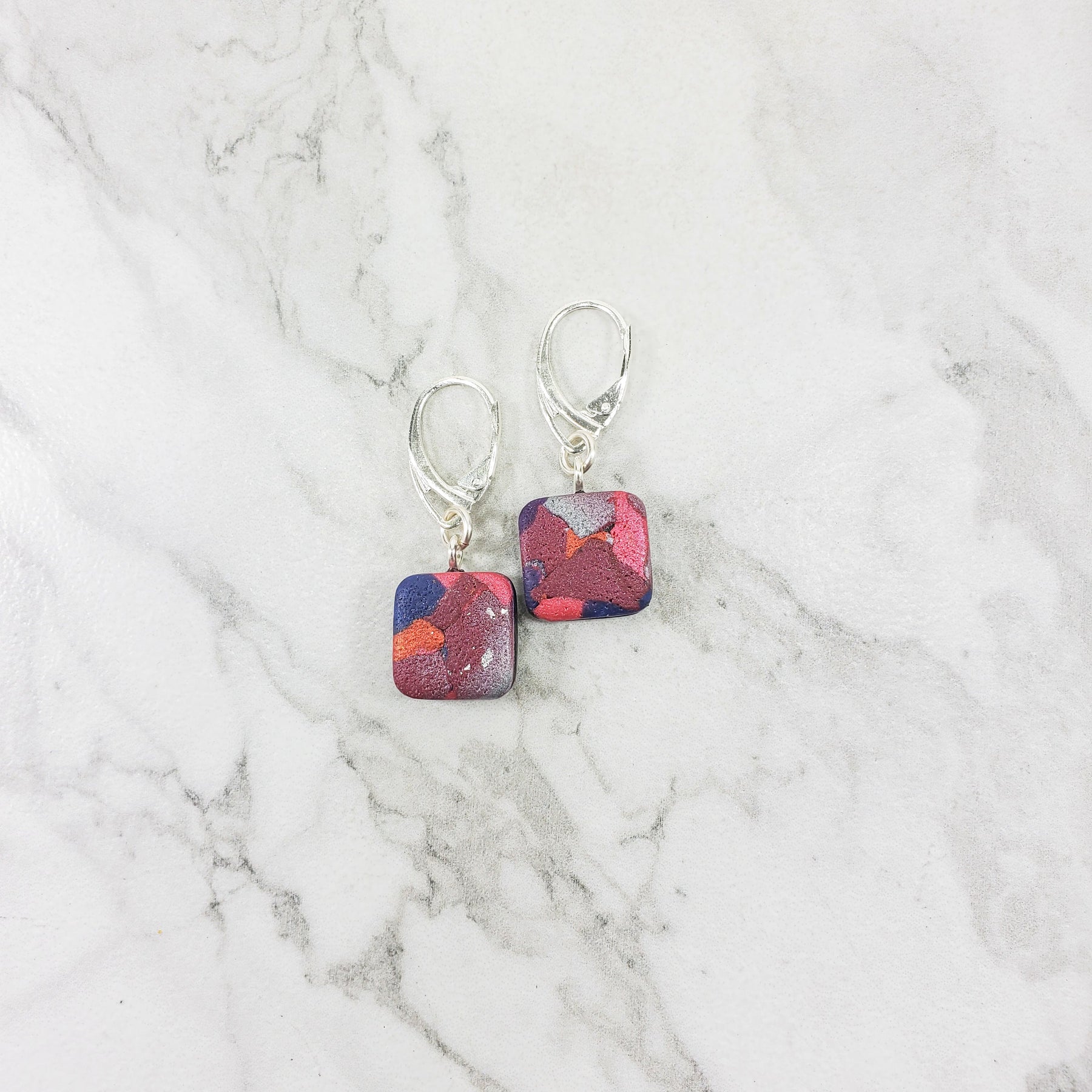 Crafted with love and attention to detail, each earring dazzles with a marbled polymer clay design of Viva Magenta, Pink Magenta, turquoise, copper, navy, purple, and silver,